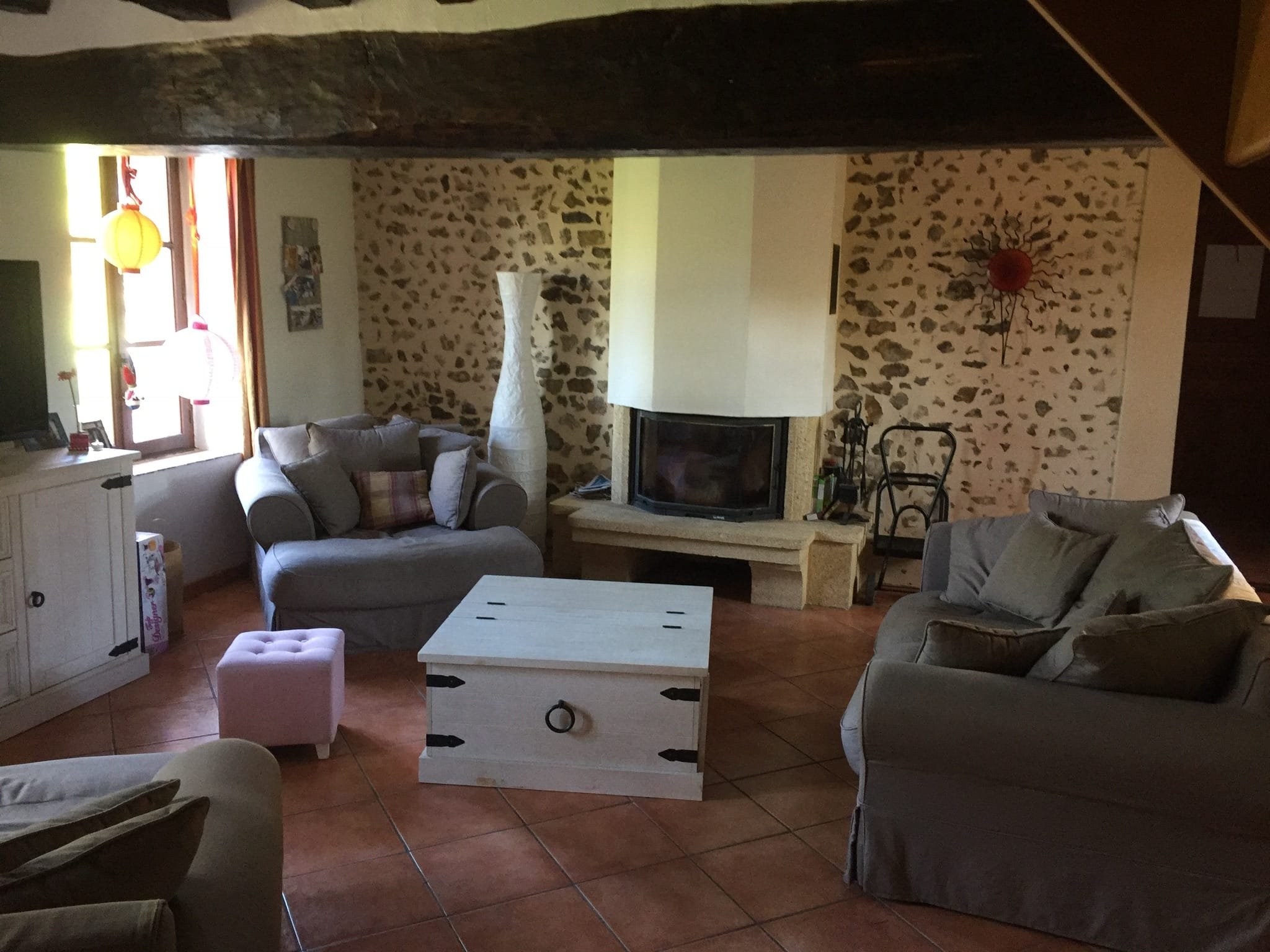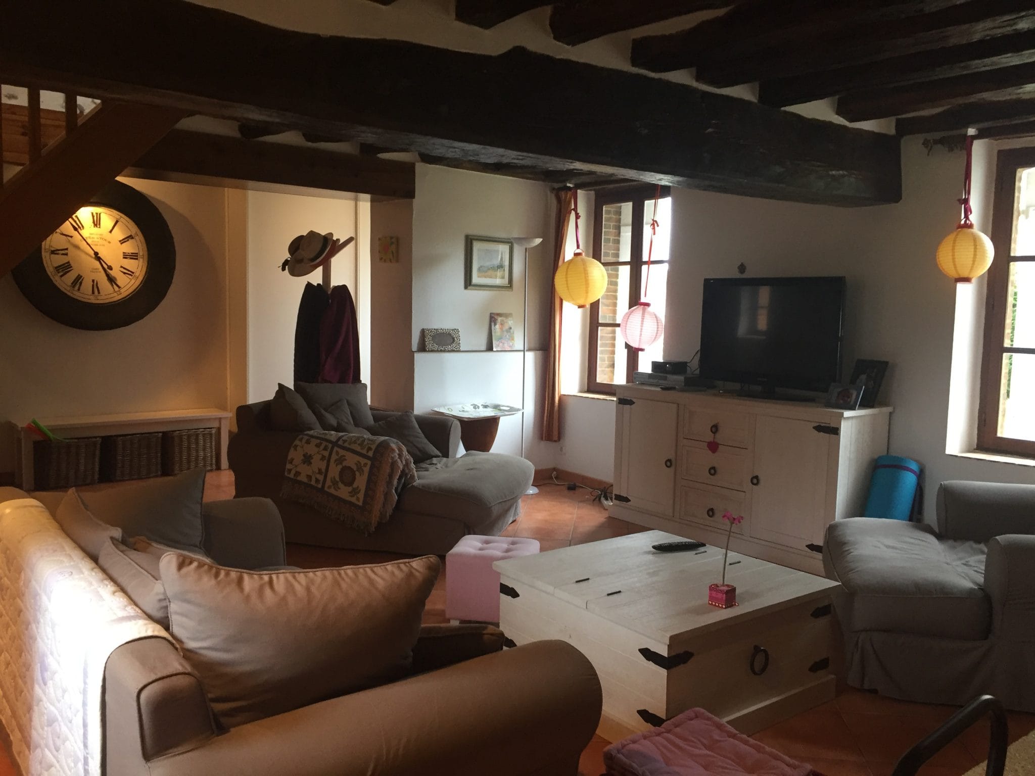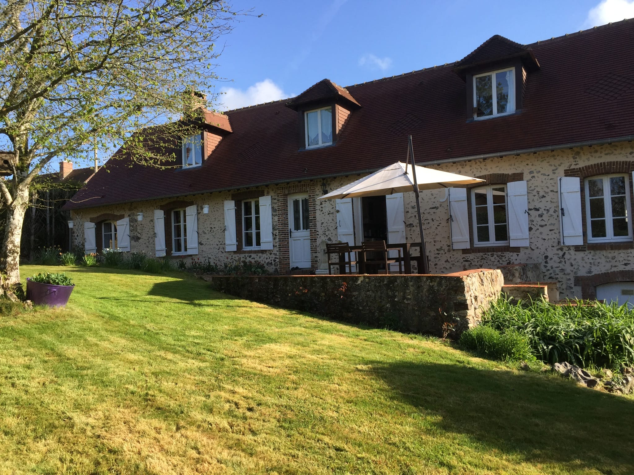 A wonderful region for walking and enjoying the superb countryside. Many local Manoirs and Chateaux and forests, pretty historic villages. The property is set in a hamlet, is not overlooked and dominates the valley. A typical Percheronne stone longere with the original beams, offers 4 bedrooms in main body of the house and there is also a connecting annexe. Ground floor: Entrance, living room with wood burner, Kitchen, Dining room with wood burning insert, bedroom, bathroom, wc. 1st floor: landing , three further bedrooms – one is a ‘walk through’ to reach another bedroom, bathroom, wc. With internal access but possibility to be independant annexe of a living room with fireplace, upstairs a bedroom, shower room and wc. Cellar and garden storage sheds. Heating is electric and septic tank drainage. The gardens are mature and terraced , patio seating areas and lawns, 1000m². The property is 5km from the town of Longny au Perche which has most amenities and a market on Wednesday. Ports of Ouistreham and Le Havre 2h and Calais 3 1/2 hrs. excellent location for accessibility to Paris and rest of France.