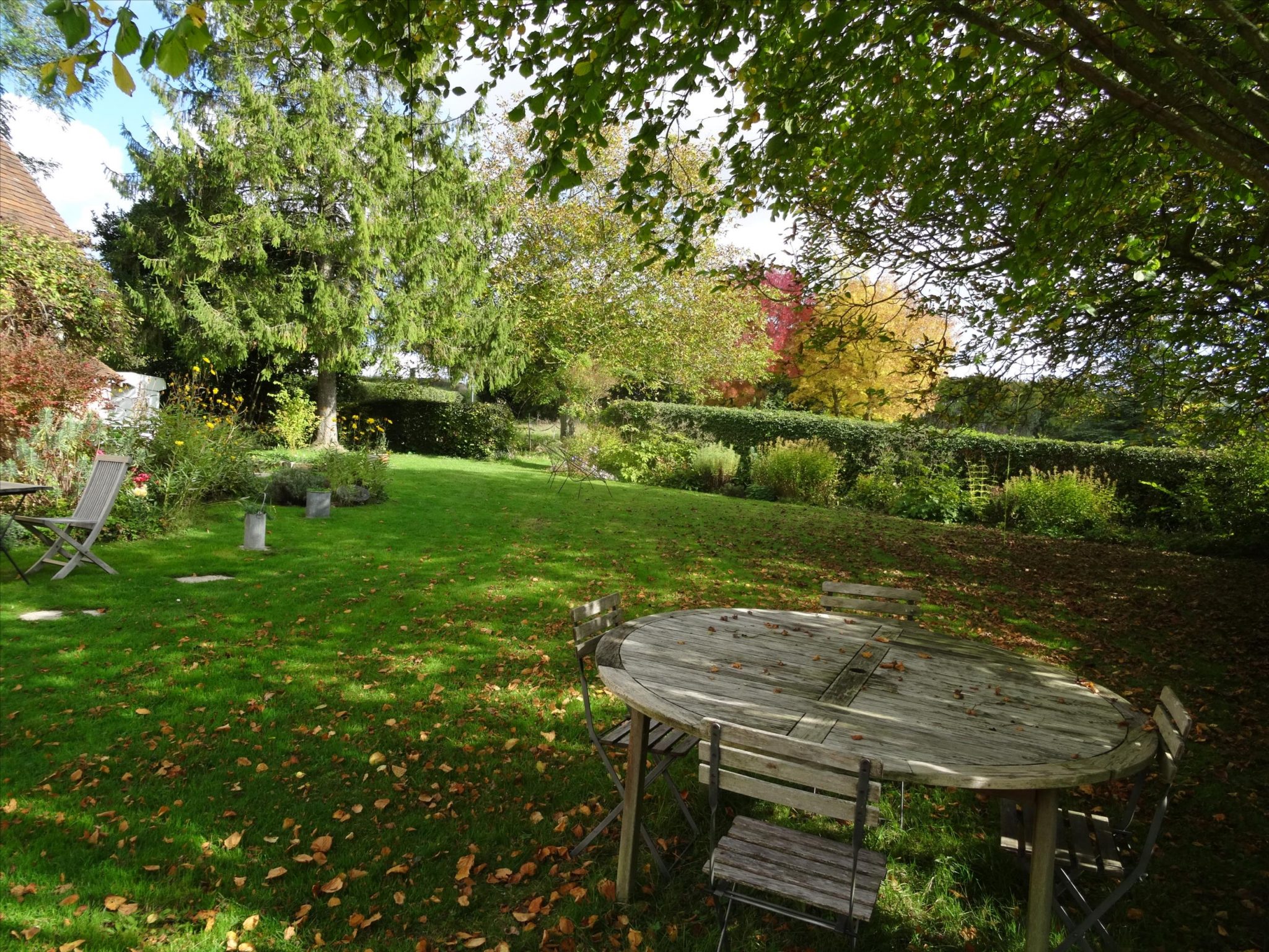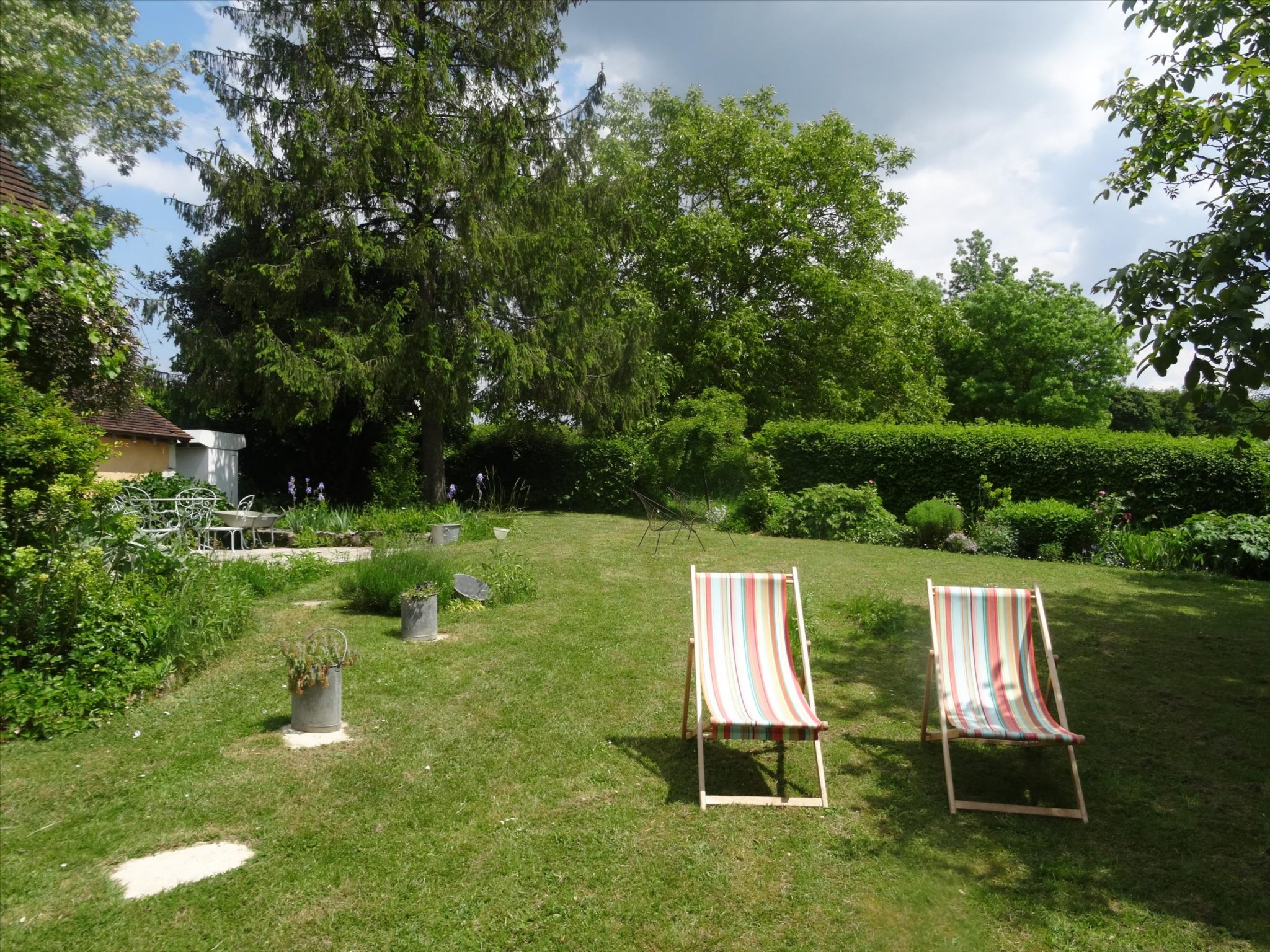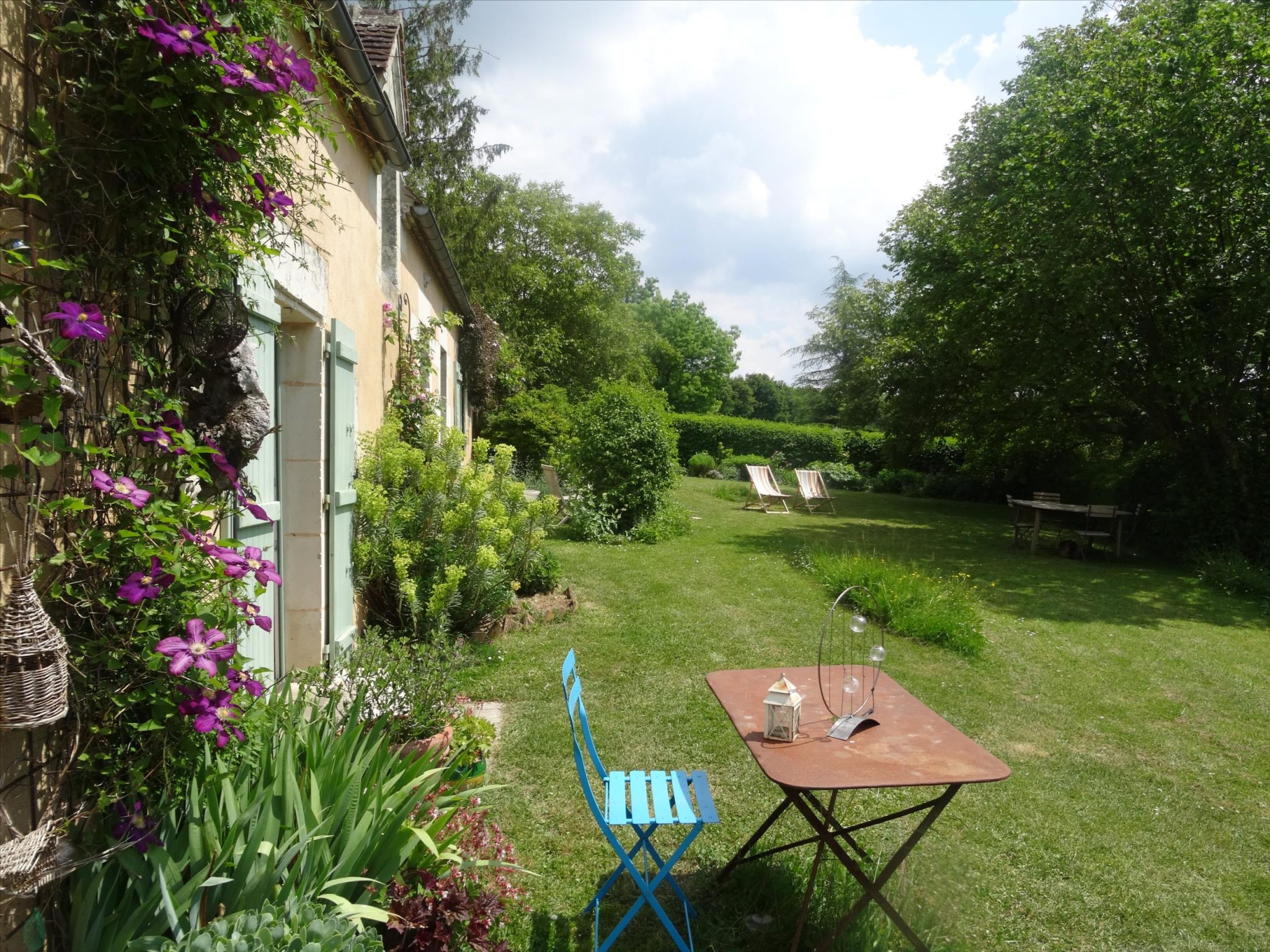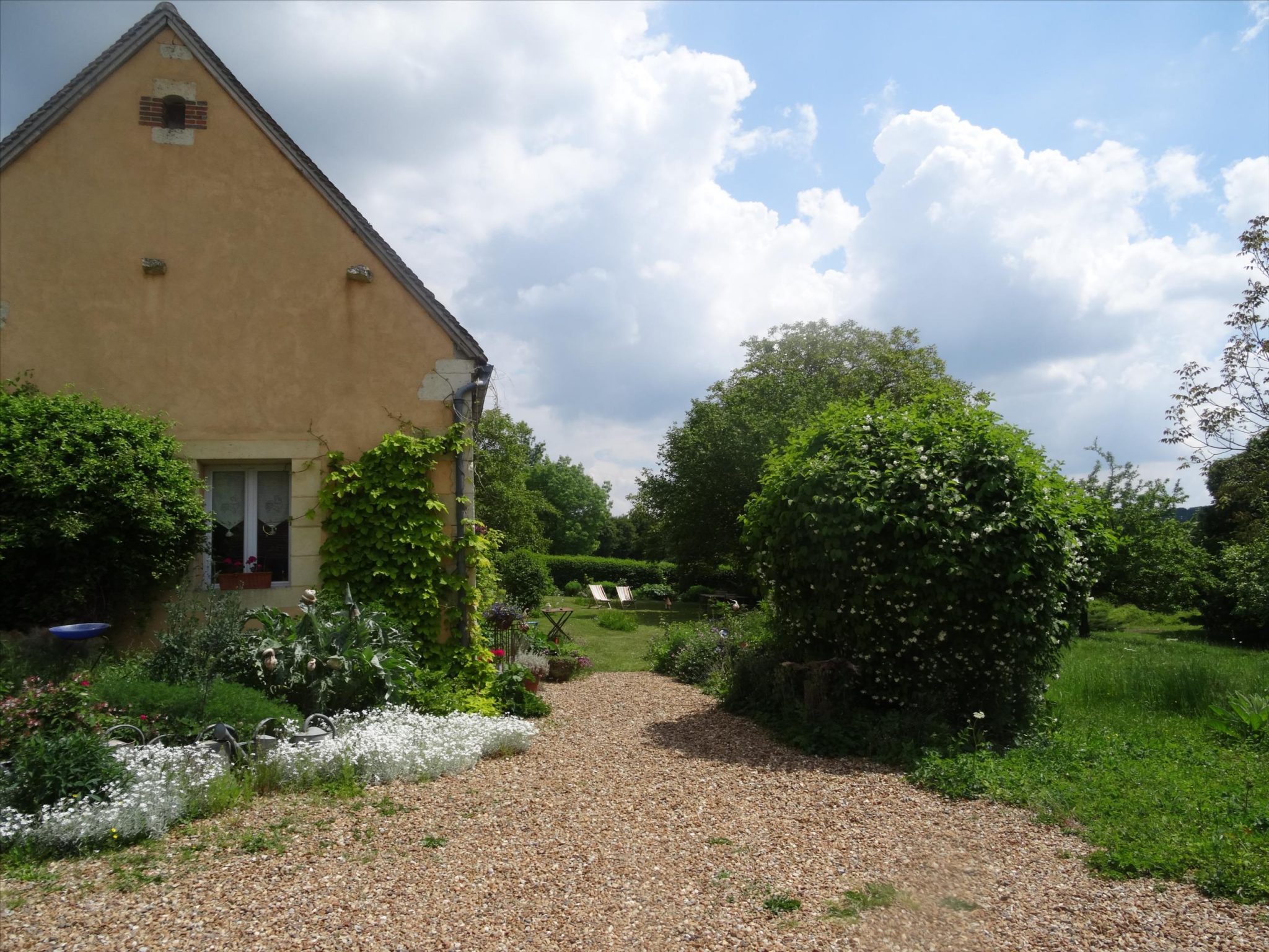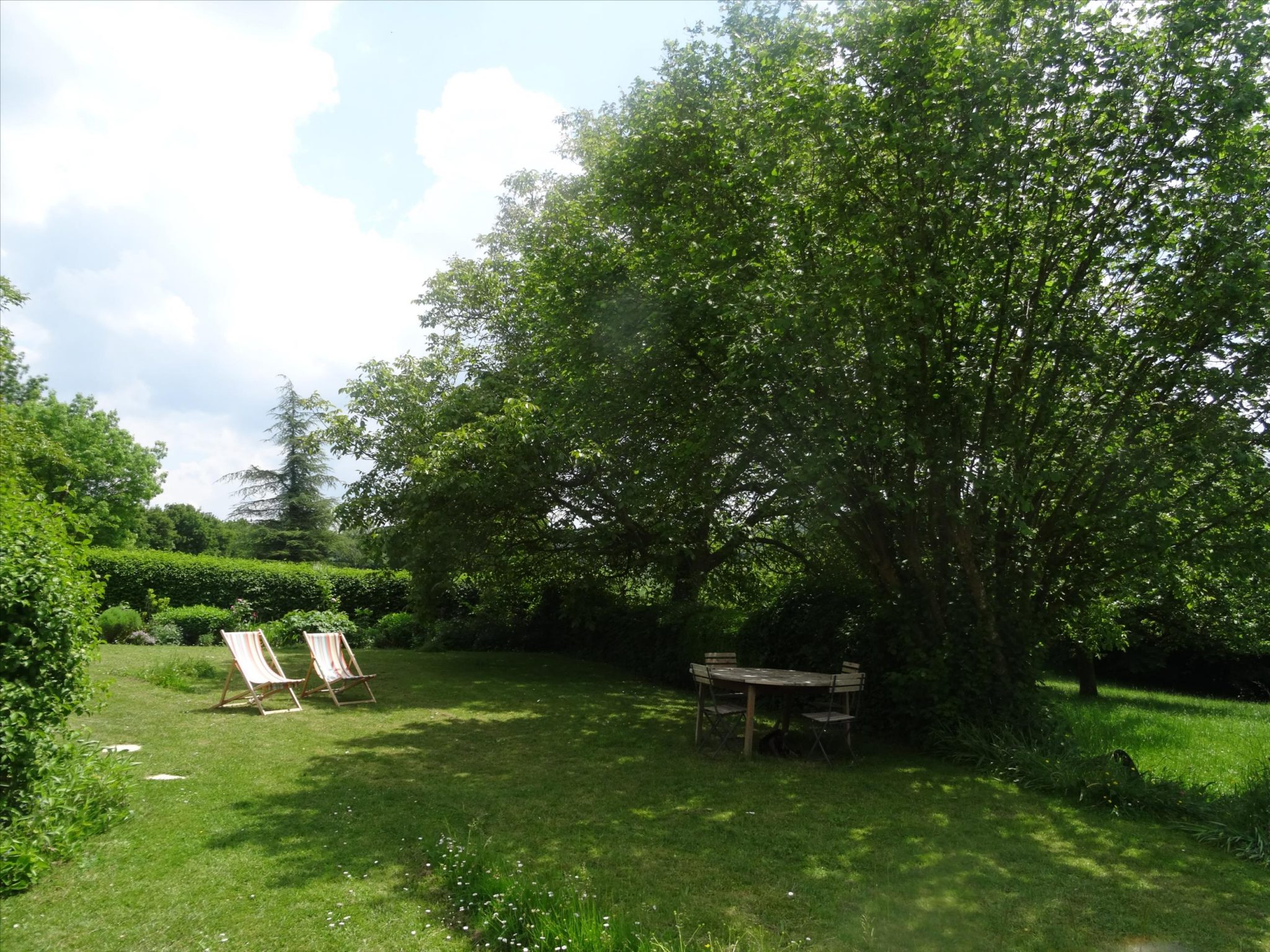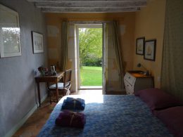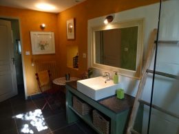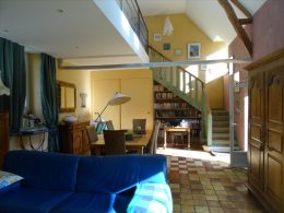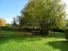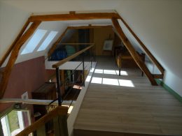 A spacious very light open plan large living/dining room with doors opening onto the gardens, with original tiled floor, stone fireplace and a cathedral ceiling. At one end there is the fitted kitchen with door onto the gardens and a utility area off the kitchen. First floor opens onto the large open mezzanine study or lounge area and there are two bedrooms, one with an en-suite shower room with wc. There are three further double bedrooms each with their own bathroom or shower room and wc – these are currently used as bed and breakfast rooms and each have independant access – two ground floor and one first floor with its own external staircase. Aerothermal pump heating system and ecological insulation solutions making an extremely comfortable house to live in and cost effective to run. Double glazed windows and mains drainage . Boiler room. large outbuilding which provides a covered parking area for two cars, workshop, loft above and a cellar below. Beautifully landscaped gardens with lovely views over the surrounding countryside. 3/4 acre south facing gardens with seating areas, patio and beautifully planted borders and mature trees. The property is 10km from the town of Thiron Gardais with a lake, shops and restaurant. Also closeby is Nogent le Rotrou which has all amenities, a huge market on Saturday and rail link to Paris. Chartres 45m and Le Mans 1h, and Calais 4 1/2 hrs. Excellent location for accessibility to Paris and rest of France.