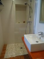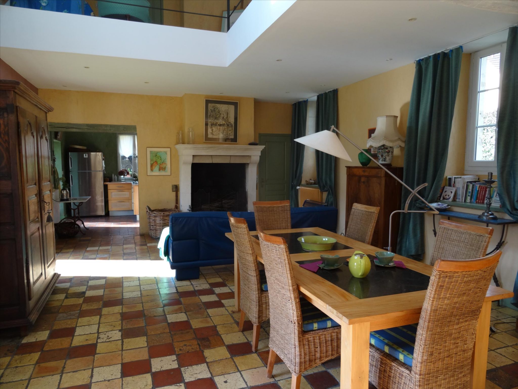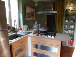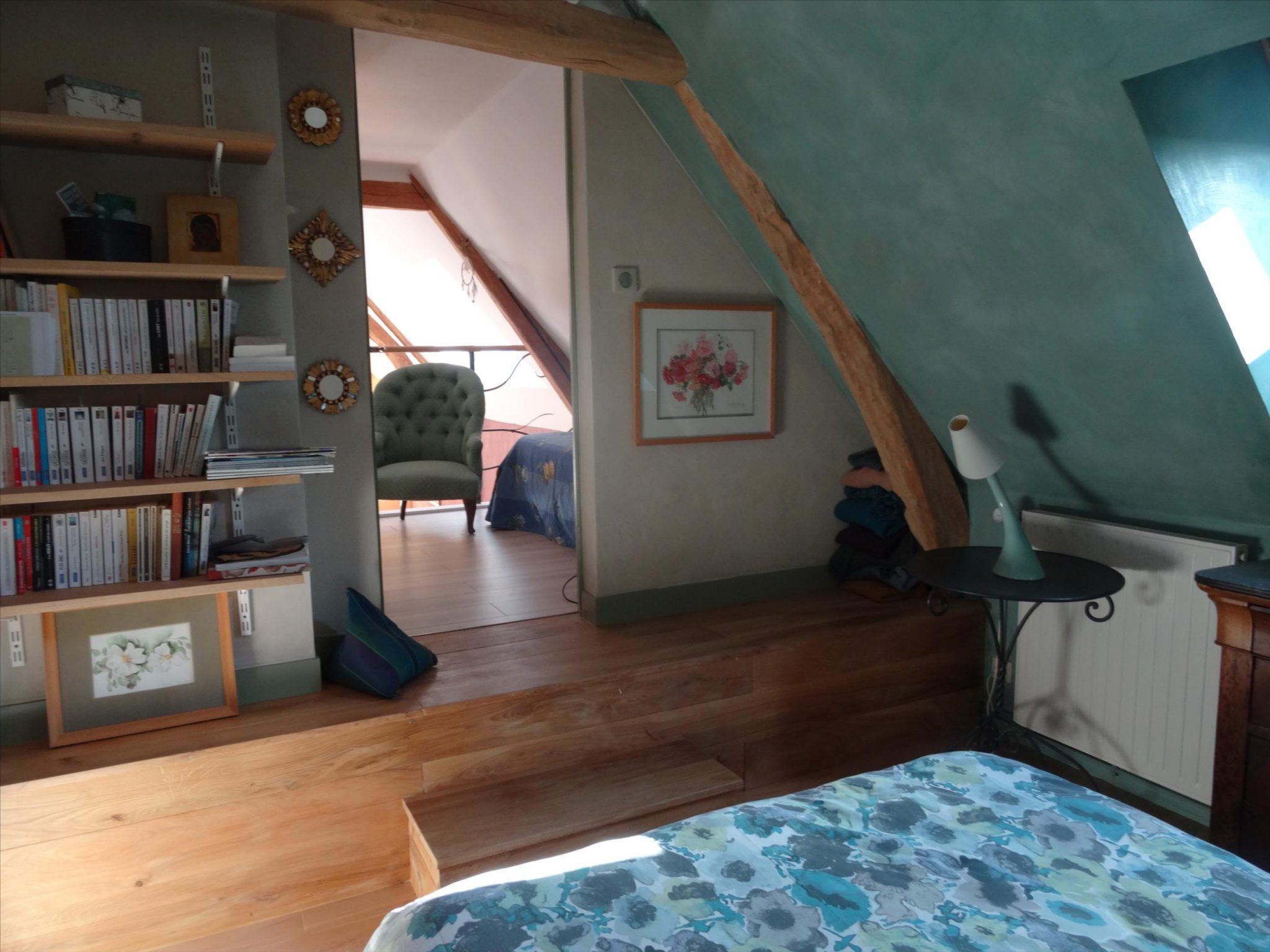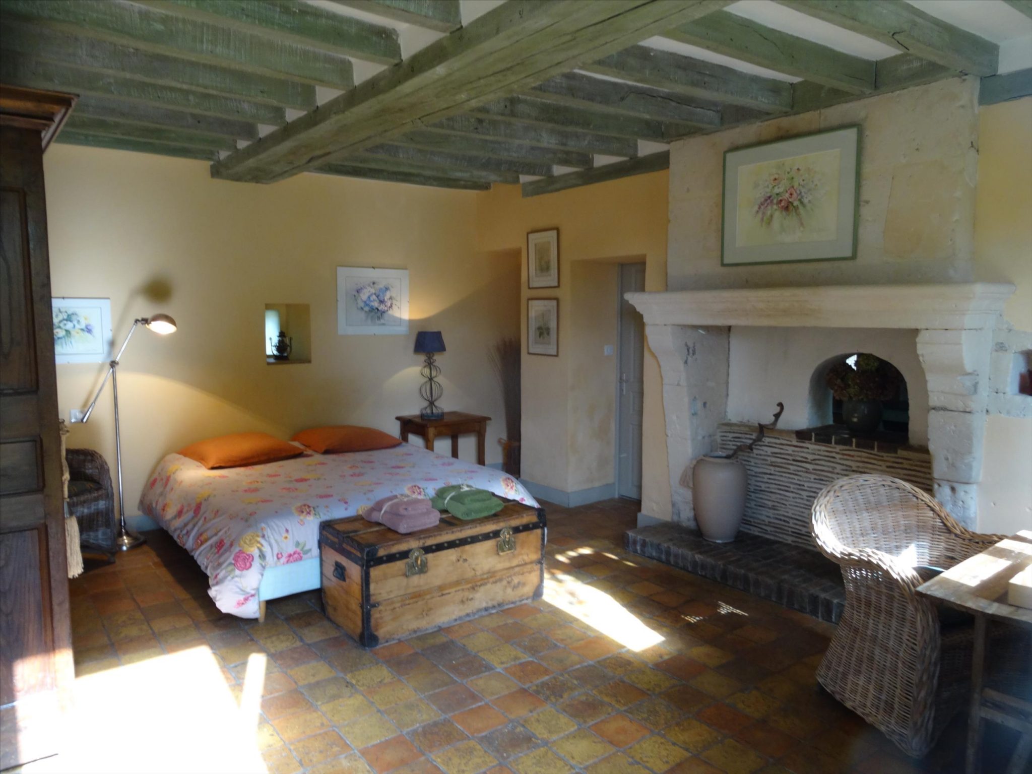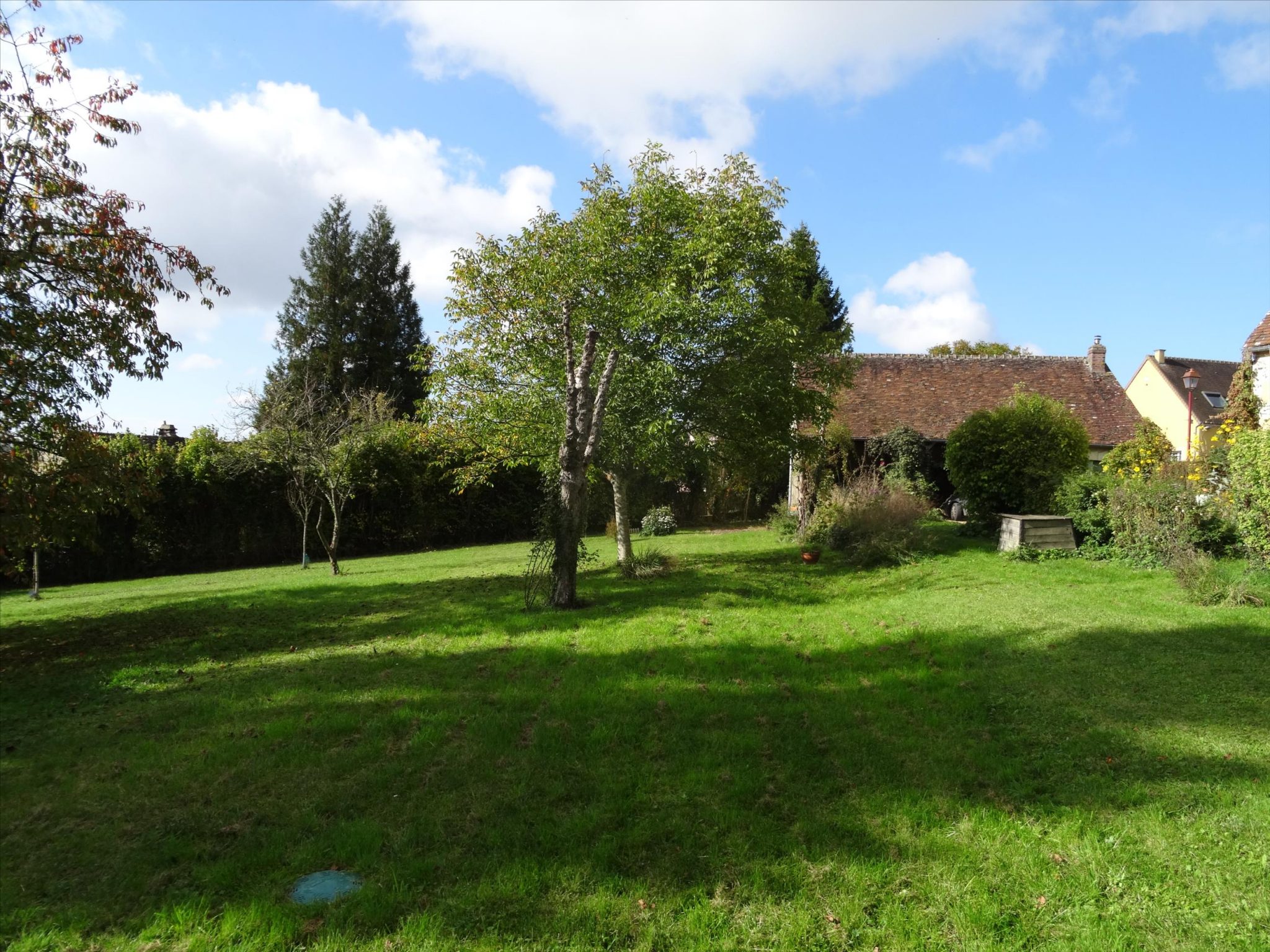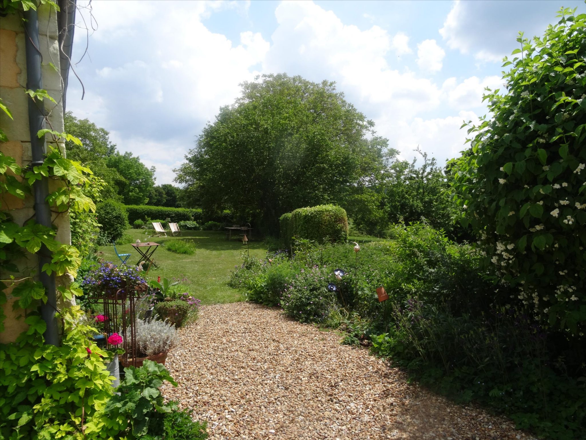 A spacious very light open plan large living/dining room with doors opening onto the gardens, with original tiled floor, stone fireplace and a cathedral ceiling. At one end there is the fitted kitchen with door onto the gardens and a utility area off the kitchen. First floor opens onto the large open mezzanine study or lounge area and there are two bedrooms, one with an en-suite shower room with wc. There are three further double bedrooms each with their own bathroom or shower room and wc – these are currently used as bed and breakfast rooms and each have independant access – two ground floor and one first floor with its own external staircase. Aerothermal pump heating system and ecological insulation solutions making an extremely comfortable house to live in and cost effective to run. Double glazed windows and mains drainage . Boiler room. large outbuilding which provides a covered parking area for two cars, workshop, loft above and a cellar below. Beautifully landscaped gardens with lovely views over the surrounding countryside. 3/4 acre south facing gardens with seating areas, patio and beautifully planted borders and mature trees. The property is 10km from the town of Thiron Gardais with a lake, shops and restaurant. Also closeby is Nogent le Rotrou which has all amenities, a huge market on Saturday and rail link to Paris. Chartres 45m and Le Mans 1h, and Calais 4 1/2 hrs. Excellent location for accessibility to Paris and rest of France.